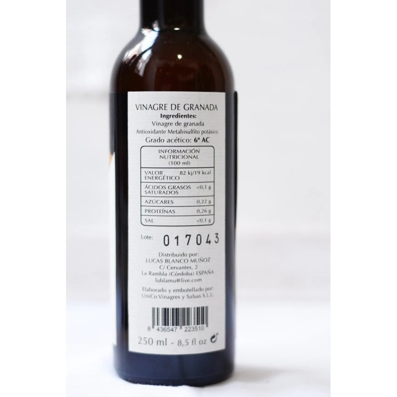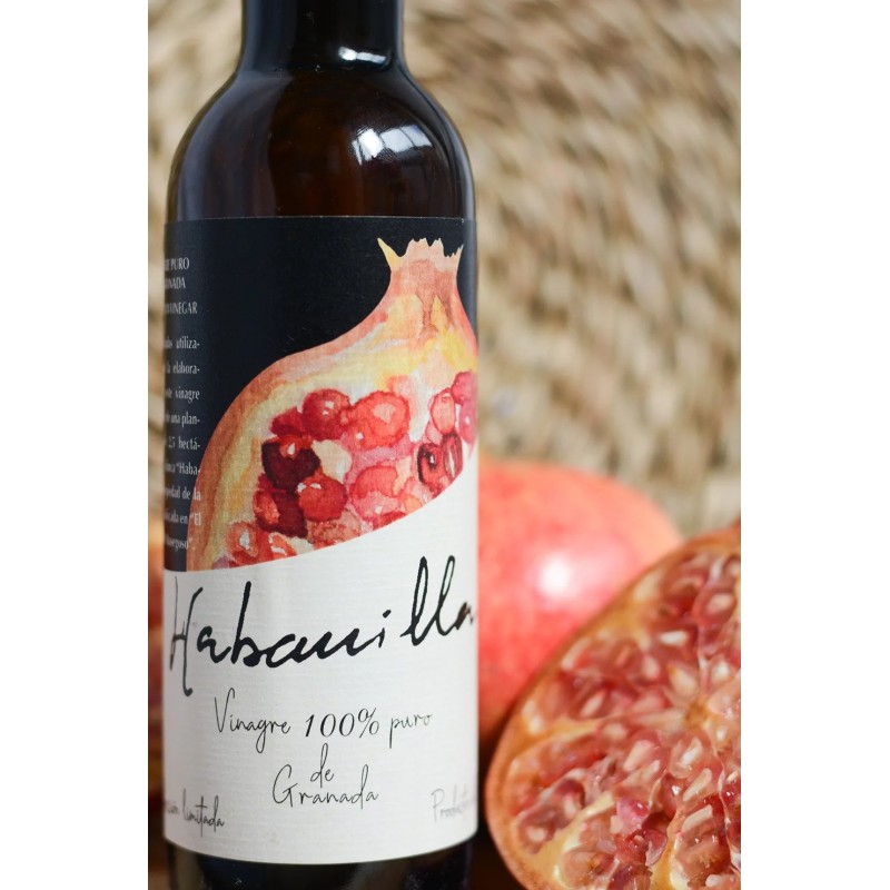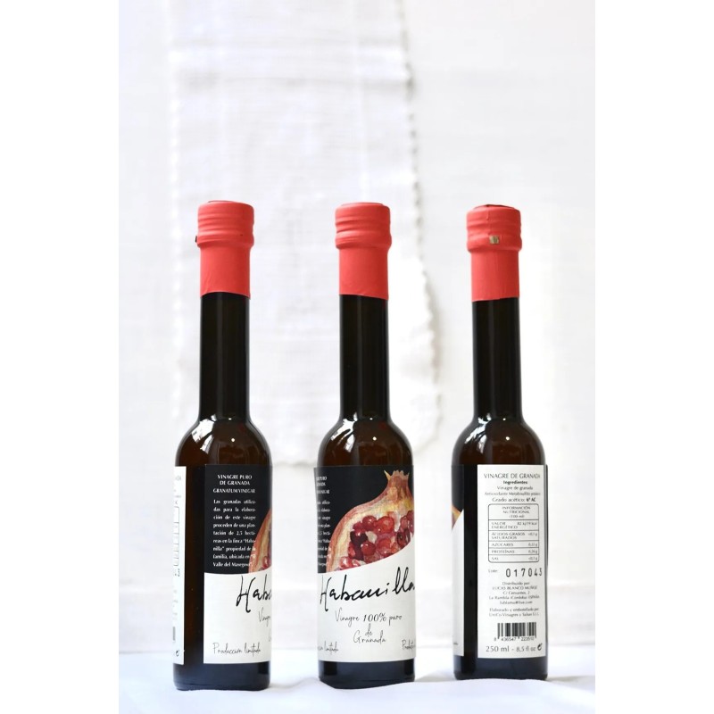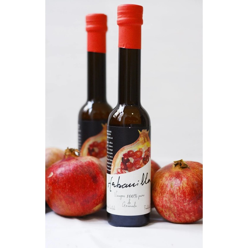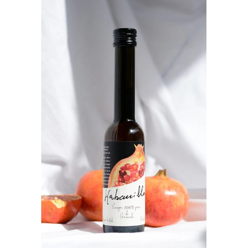 El vinagre de granada presenta un tono rojizo que recuerda a los granos de la fruta, resultado de la propia materia prima y de la oxidación natural. Se trata de un vinagre marcadamente afrutado, elaborado a partir de granadas procedentes de una plantación de 2,5 hectáreas en la finca Habanilla, situada en el Valle del Masegoso. Un producto 100 % natural obtenido directamente de la fruta.